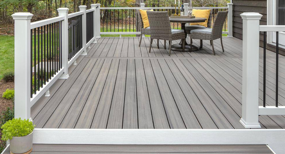 The Trex decking in the picture showcases a modern and low-maintenance composite material with a natural wood grain texture. The railing features durable balusters providing aesthetic appeal and functional safety.