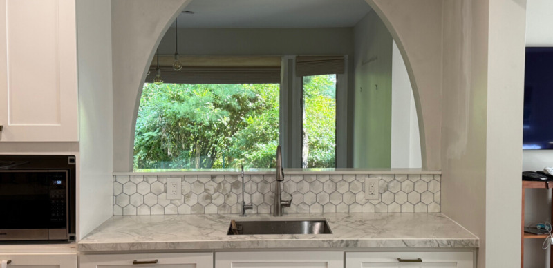 Modern finishes with a classic architectural feature. The arched pass-through window above the counter adds openness and flow between rooms, while the white shaker cabinets, backsplash tiles, and marble countertops create a clean style.